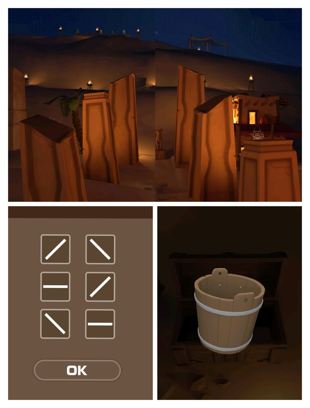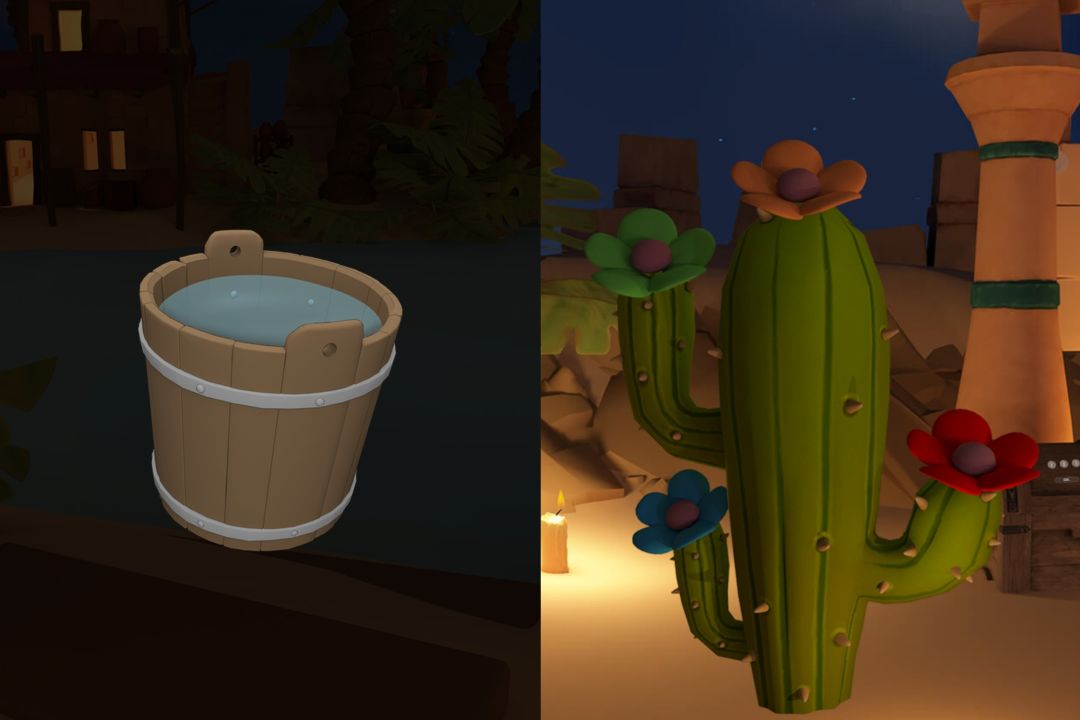 4.根据④后方石柱 打开②右边箱子 得水桶 到③河边打水 浇灌①仙人掌