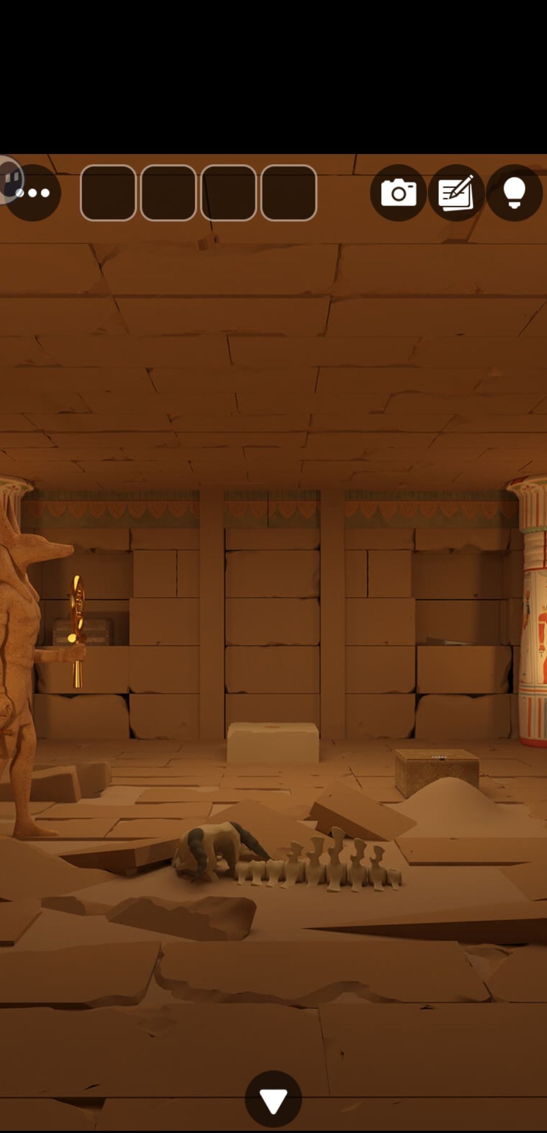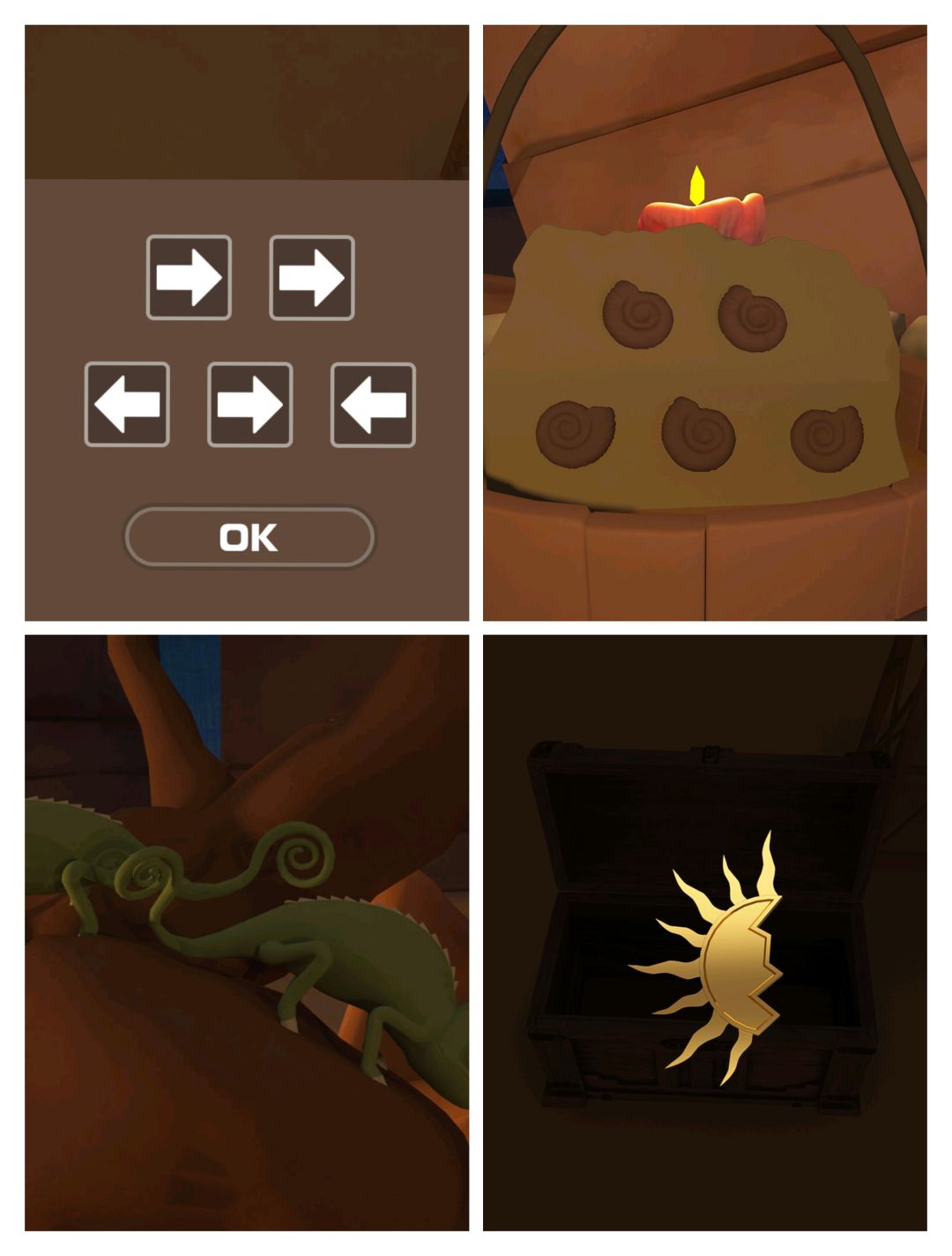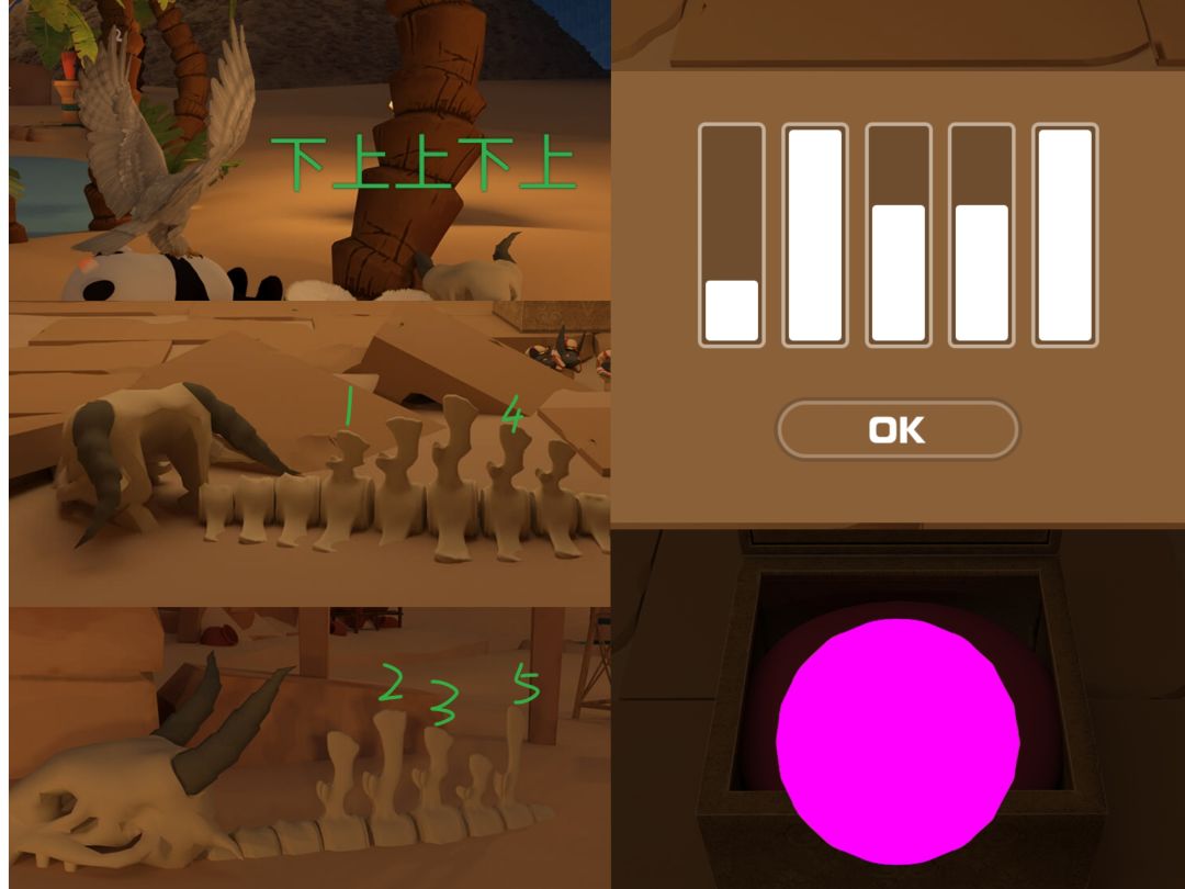 3.根据④蜥蜴方向和尾巴 结合①贝壳提示 打开③左后方箱子 得一半碎片