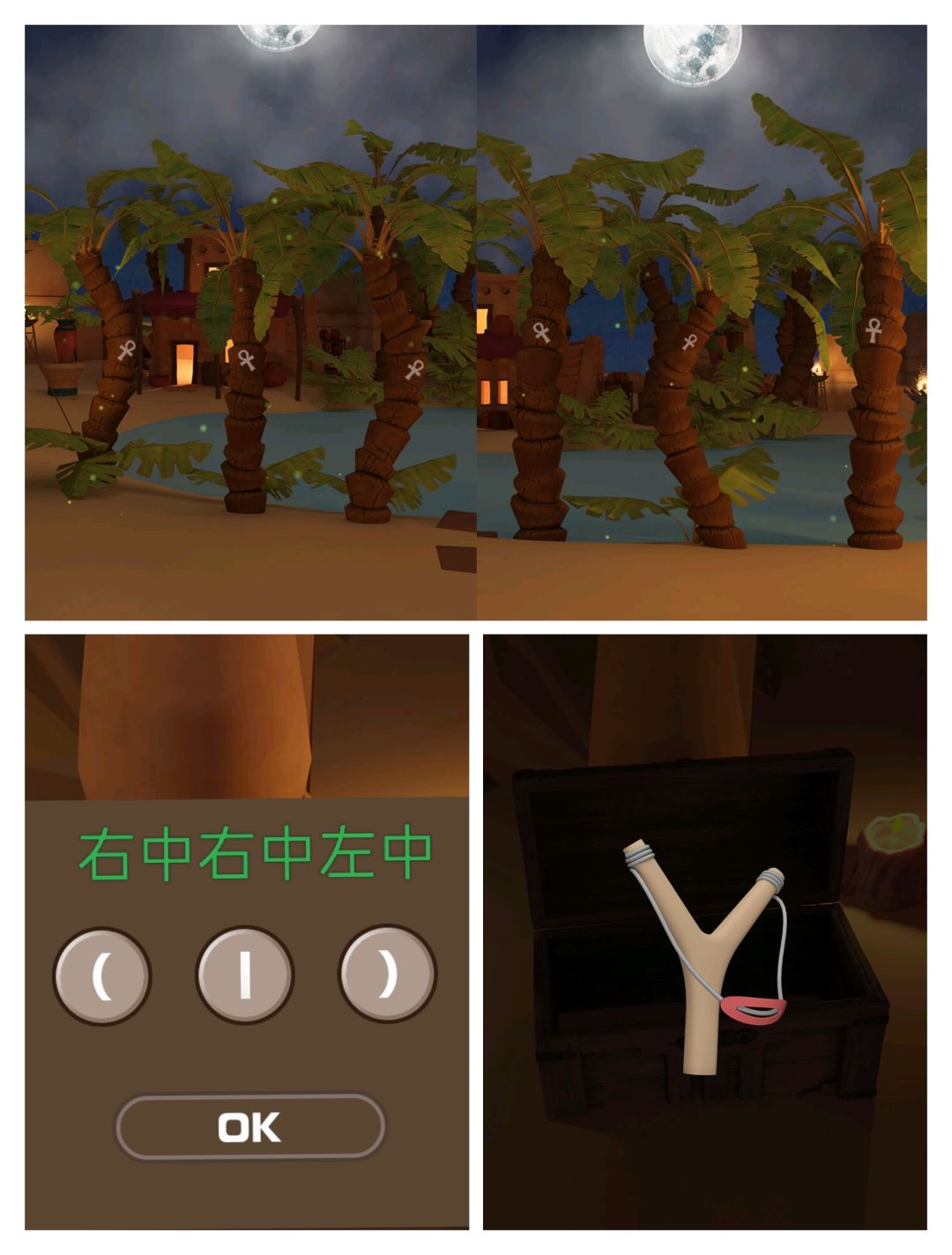 2.根据③椰子树的弯曲方向(右中右中左中) 打开①后方左箱子 得弹弓