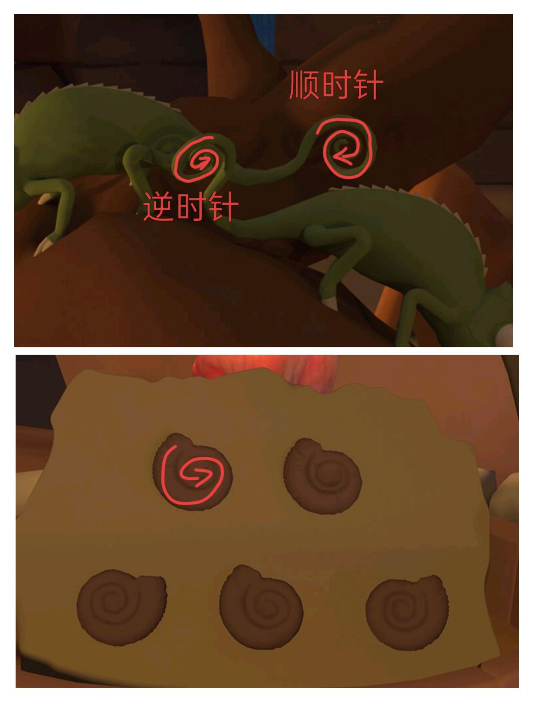 〈左边蜥蜴的尾巴是顺时针 右边逆时针 第一个贝壳是逆时针 对应右边 其余同理〉