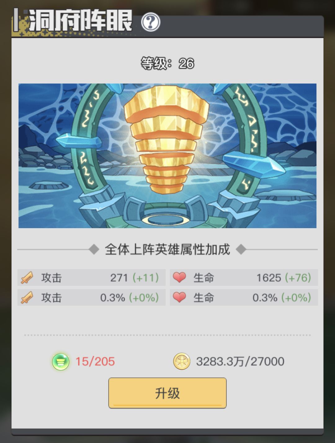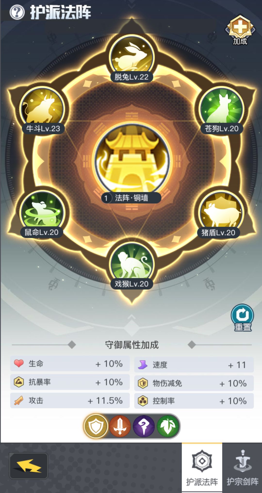护派法阵升级门派的护派法阵,可提升上阵英雄的属性。守御法阵可给上阵的守御职业英雄提升属性,同理强攻、魔法和辅助法阵都可作用同类型职业的上阵英雄~护派法阵中的技能达到一定等级可解锁专属职业被动技能!