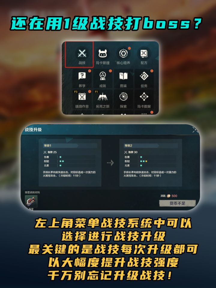 战技等级是可以直接提升战技伤害的,不会还有人再用1级战技打20级boss吧?攻略附上。左上角菜单战技系统中可以选择进行战技升级,最关键的是战技每次升级都可以大幅度提升战技强度。千万别忘记升级战技!