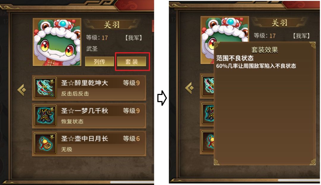 第二,假如武将穿了其他武将的套装,则套装1,套装2,圣套效果中,只有套装2生效。例如关羽穿了浮生圣套,则只有套装2效果-范围不良状态生效。