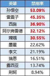 禁用率榜-嫦娥西施排名上升,阿尔弗雷德回落。