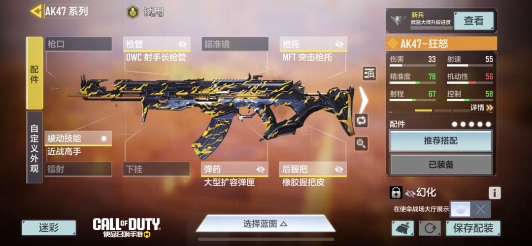 AK47-狂怒装备了OWC 射手长枪管、MFT 突击枪托、橡胶握把皮,大幅减弱了举镜子弹散布和后坐力,并增加了射程;装备大型扩容弹匣,使其拥有更高的容错率;被动技能则配置的是:近战高手,使战士们在近距离消灭敌人后,还能恢复一定子弹量。