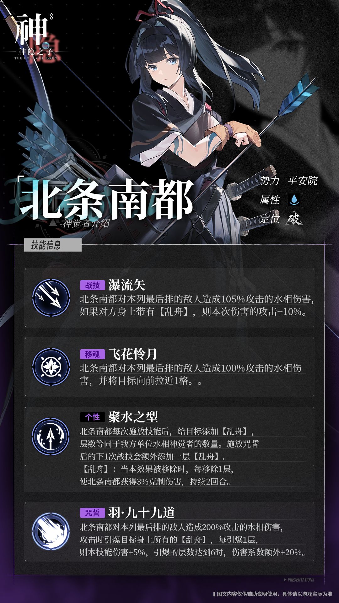 现平安院御书寮【左书使】,是一位拥有着娃娃脸与少女身姿的神觉者,能拉开大型穗秋长弓的同时,头顶负重物而纹丝不动。有御书寮的御神使暗中透露,左书使的这个技能在搬资料时最受大家好评,甚至可以抵消她带来的扳手腕阴影。