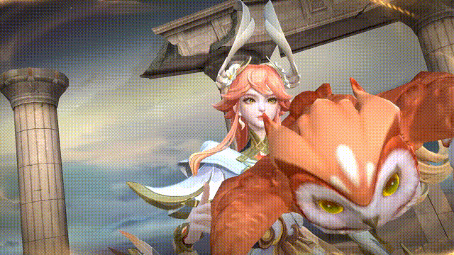 角色造型上使用了羽毛、树叶、花环等自然系元素,身侧跟随的猫头鹰特瑞斯是她的伙伴。我们尝试将猫头鹰的元素运用在武器造型上,把阿尔忒弥斯的长弓设计为一只猫头鹰展开翅膀,栖息在金色的圣树上。当箭矢离弦的瞬间,尾羽拖曳的流光撕裂黑暗,那射出的不再是箭矢,而是自然的教诲。