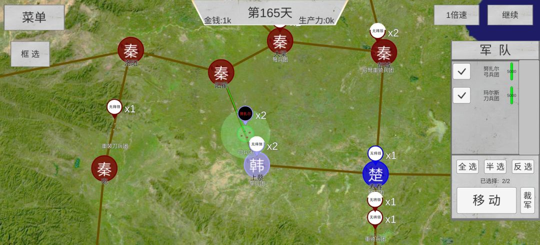 第三步,固守上蔡等待资源积累。右方寿春会派出弩兵团不断进攻,需要微操防守尽量不要让自家兵力折损,然后过一段时间后王翦会直接下来进攻上蔡。在这时拿出你能拿出最好的部队(如图165天。我是选的弓兵团+刀兵团)安上将领将其拿下。