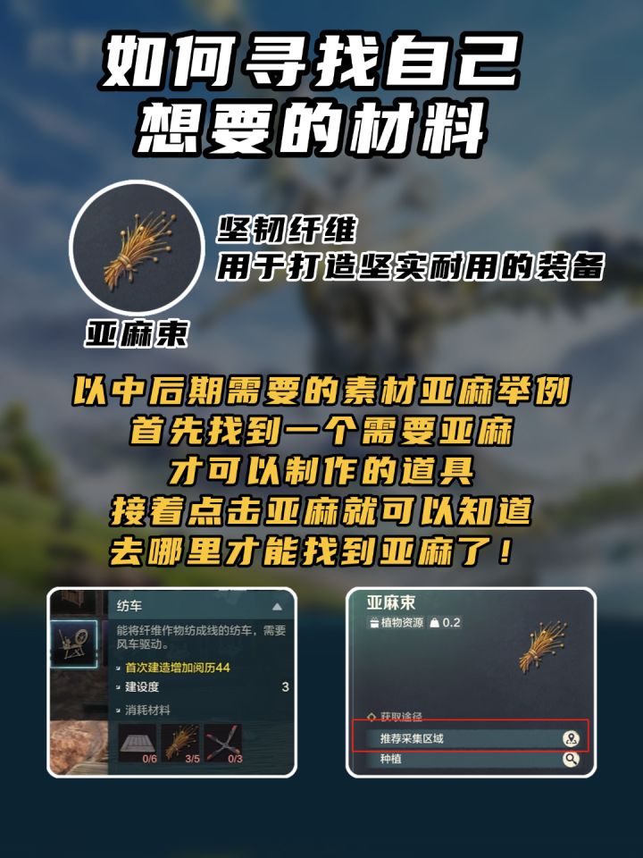 首先找到一个需要亚麻才可以制作的道具→接着点击亚麻就可以知道去哪里才能找到亚麻了!非常的好用!