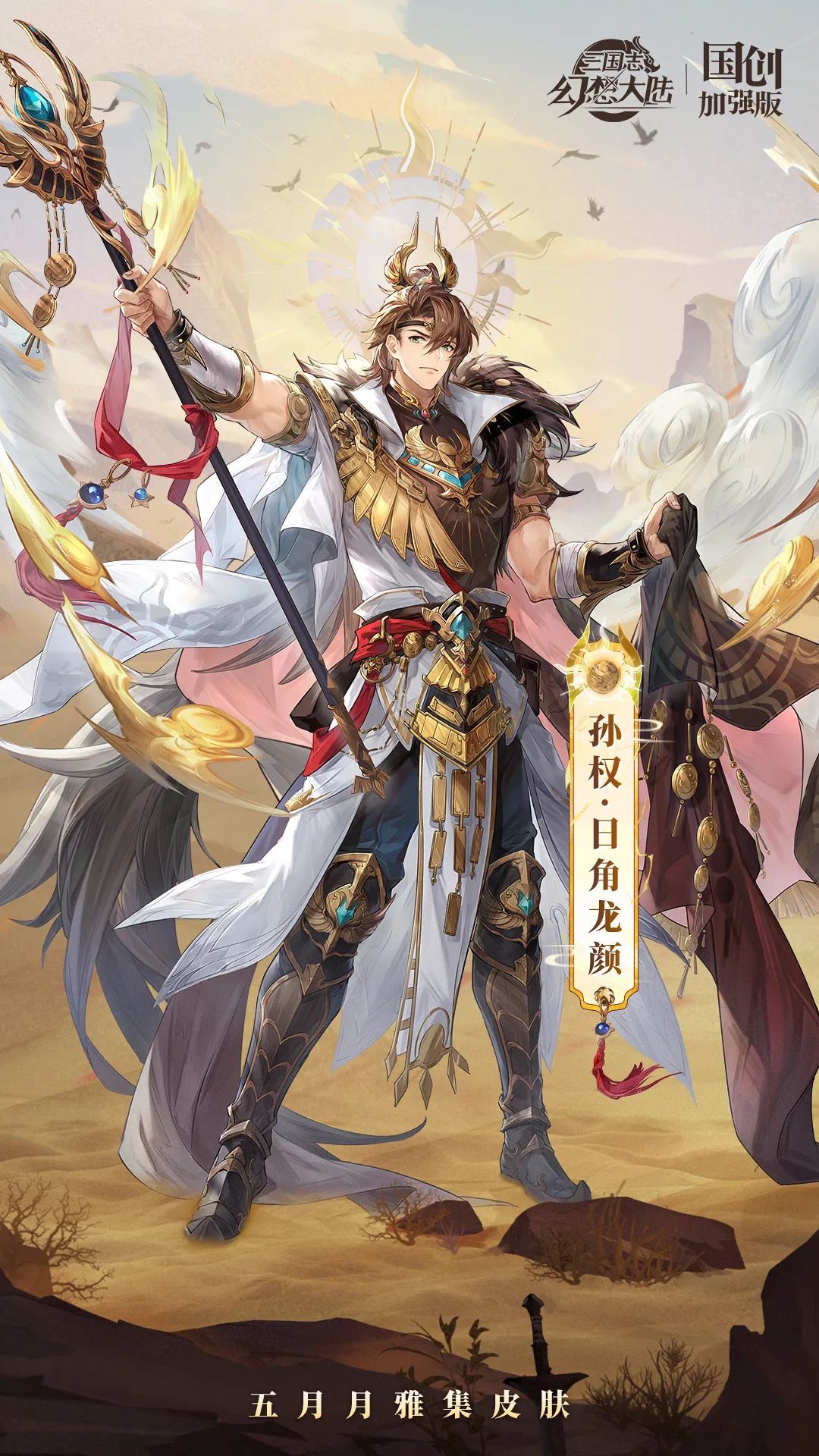 本次设计以“异域文化”为主题,塑造了一位君临天下、雄霸一方的君主形象。孙权身着一袭白色长袍,胸甲和腰带上雕刻着精致的异域纹路,黑色毛绒披风则象征着异域神明的威严与神秘。他高举权杖,身后是象征太阳神的日盘,光芒四射,尽显其意气风发与无上权威。