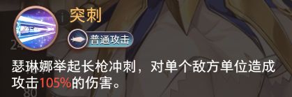 瑟琳娜举起长枪冲刺,对单个敌方单位造成攻击105%的伤害。