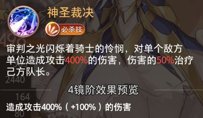 审判之光闪烁着骑士的怜悯,对单个敌方单位造成攻击400%的伤害,伤害的50%治疗