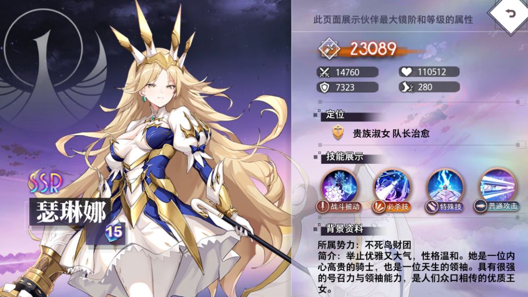举止优雅又大气,性格温和。她是一位内心高贵的骑士,也是一位天生的领袖。具有很强的号召力与领袖能力,是人们众口相传的优质王女。