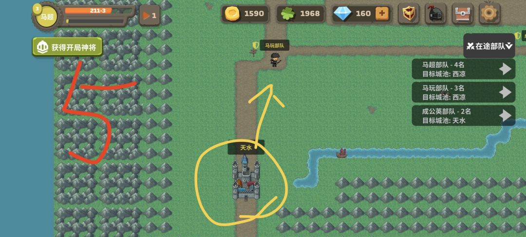 看完广告后可得一个神将(入群之后可以获得2个神将)将安定城的武将全部撤离至天水 ♥重点提示:如果前两个回合曹操势力长安没有攻打定安,那就重新开档因为每个回合AI升级的速度比玩家快,没有必要浪费时间♥ (这里有一个技巧,很多时候曹操都会攻打你,第一个回合时可以等等看,等他出兵之后再撤离)曹操打完安定这时候就差不多进入了内政,内政什么都不要管,优先搜索(有概率获得武将和武器)有武器就优先给马超以及有技能的武将安装,以及用10个钻石在道具库里买一瓶〔士气水〕保守起见(有把握可以不买)。