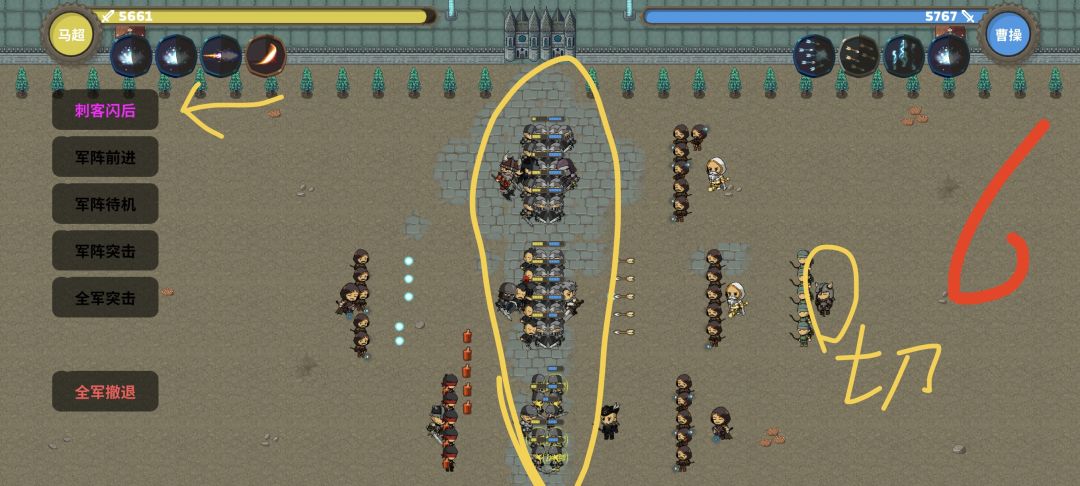接上曹老板攻打西凉,我们回去把兵补完之后就开始打。这步主要就是看广告的时候得什么武将(群攻最好)以及每个人对游戏理解。(有一个小技巧,我需要说一下,刺客闪现的时机:开完局先别动,敌方完全到达跟前,盾牌立起来,然后刺客再闪现,这样就不会浪费隐身时间去追)