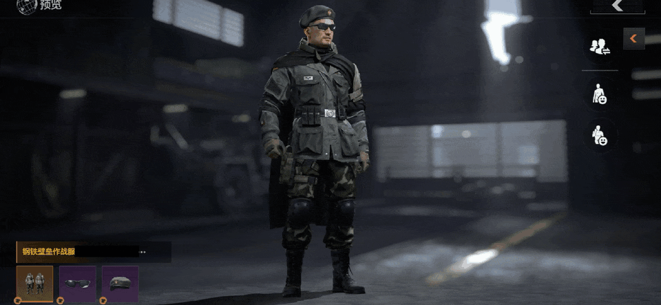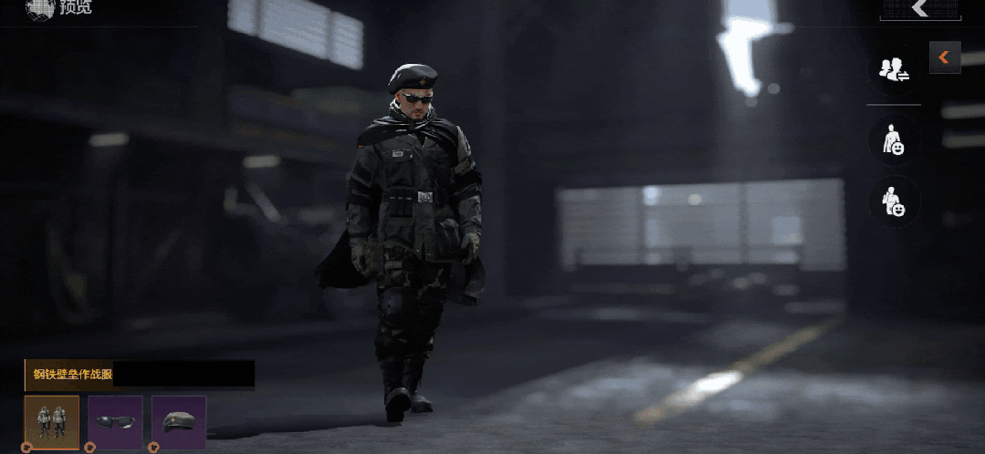 雷诺伊尔同款外观「钢铁壁垒作战服」,该套装由披风、贝雷帽与墨镜三个部件组成,黑与灰的肃穆配色勾勒出了一个饱经战火洗礼的战士形象。