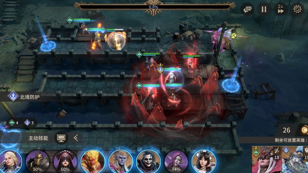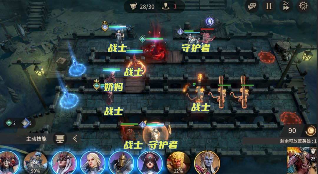 这关用多个战士来防守即可(如果战士不足,也可以用守护者抵挡,高台位打输出),不挑英雄、能打伤害即可。上路及中路会刷潜渊者,要进行二段式防守,中路前方的战士最好自身有一定生存能力,要脱奶输出;奶妈可给两战士提供续航,用来抵挡怪物进攻。