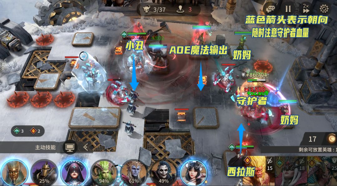 1、开局依次放置西拉斯、小丑、守护者(及下方奶妈),西拉斯、小丑初期有终结技就开用来清理冰雕。