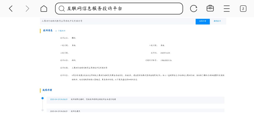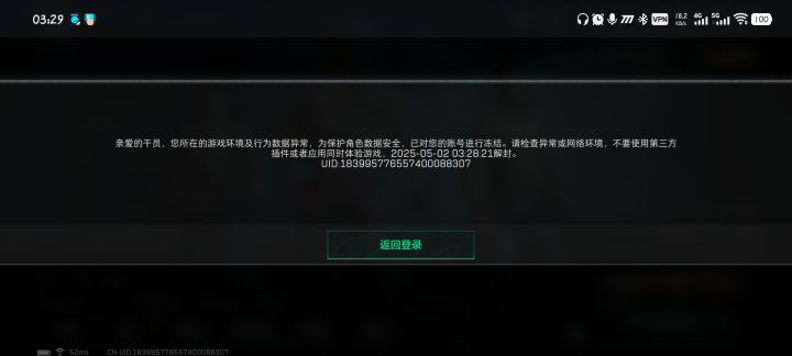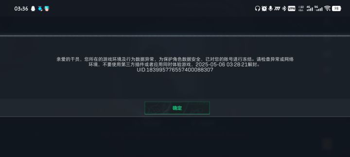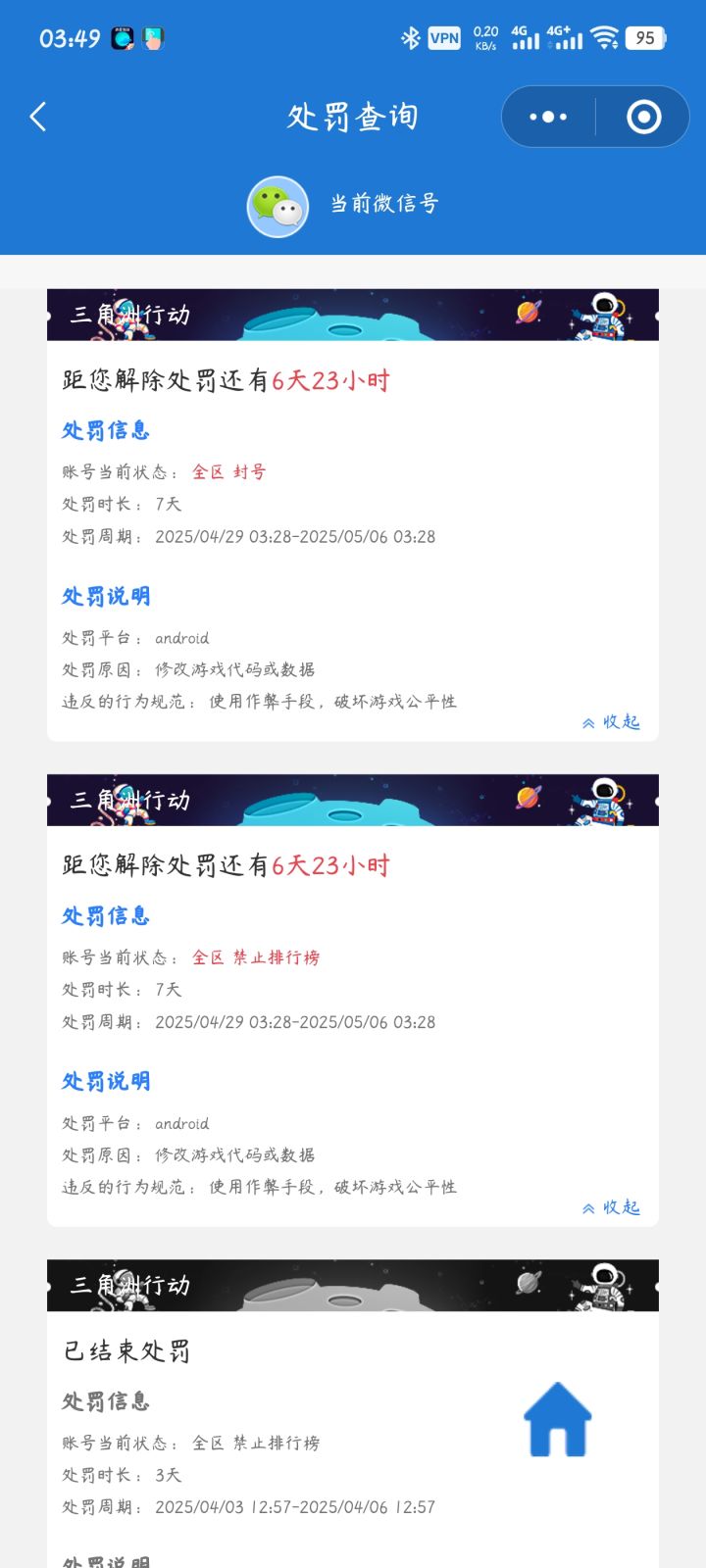 3点28分的时候正在打着突然冻结显示3天,退出登录再上就变成7天,号一直是自己在玩,没有给别人登过,后台只有微信QQ和腾讯手游加速器,上次被封是4月3号封了3天,理由和这次一样说我修改游戏数据,投诉已提交,等后续
