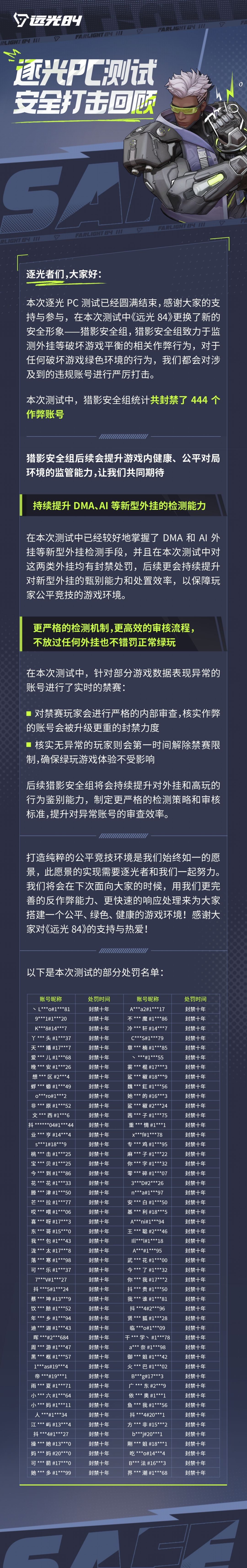 打造纯粹的公平竞技环境是我们始终如一的愿景,此愿景的实现需要逐光者和我们一起努力。我们将会在下次面向大家的时候,用我们更完善的反作弊能力、更快速的反馈打击来为大家搭建一个公平、绿色、健康的游戏环境!感谢大家对《远光84》的支持与热爱!