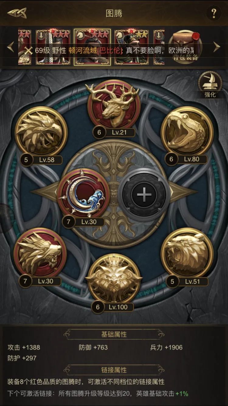 图腾分为蓝色,紫色和橙色图腾,蓝紫色只是过渡,在橙色没出来之前在资源溢出被打的情况下作为仓库使用,所以不要强的太高(失败概率高,浪费),宁可多强几个,一般在二十级以下比较好。橙色图腾由于可以转红且成套到一定等级有战力加成,所以得重点培养,以下仅谈谈橙色图腾。