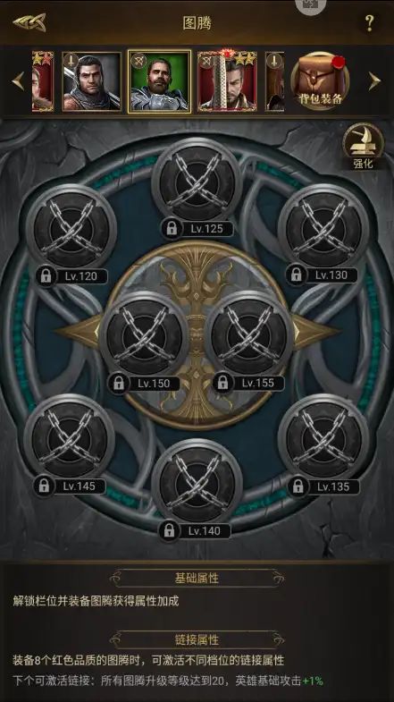 (普通图腾)120级图腾:兵力属性 125级:攻击属性 130级:防御属性(高级图腾)135级图腾:兵力属性 140级:攻击属性 145级:防御属性(顶级图腾)150级图腾:攻击属性和防护属性 155级图腾:防御属性和破甲属性图腾分为蓝色,紫色,橙色,红色四种。目前游戏版本,红色图腾就是顶配了,由于红色图腾是由橙色图腾转变的,所以我们需要获取橙色图腾。获取方式:1.节日活动会出橙色图腾碎片。2.常规操作战火燎原活动,积分兑换。3.战役掉落橙(概率很低,普通图腾掉落概率比较高一点,高级几乎看不到,顶级图腾无法掉落)