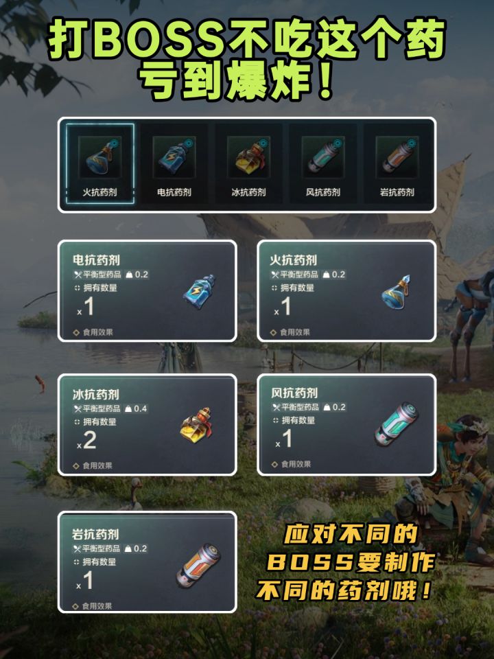 还在靠出众的操作打boss?针对抗性药剂帮你轻松通过boss,应对不同的BOSS要制作不同的药剂哦!