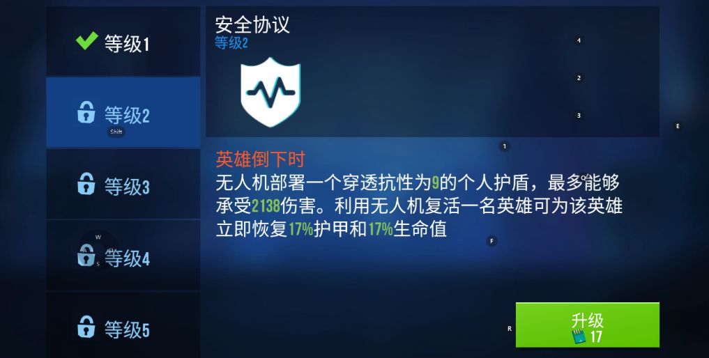 当无人机达到二级后可以解锁安全协议,此时的作用会大大增强,不仅可以为自身带来高额的护盾,利用无人机进行复活后可为英雄恢复部分护甲和血量,瞬间提高即时战力,扭转对局。