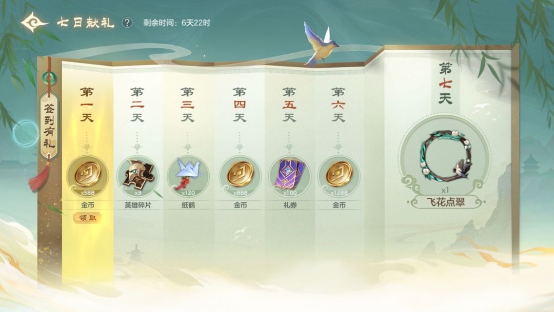 每日登录游戏可以领取礼券*100、飞花点翠头像框、纸鹤*120、英雄碎片等奖励。