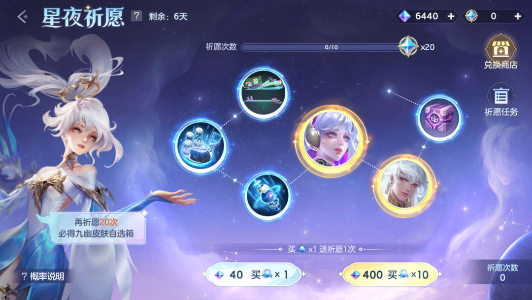 使用龙晶进行祈愿,有几率获取天工皮肤(阿尔忒弥斯·星海之华、诸葛亮·无念净土)、九幽皮肤自选箱、全息传输回城特效、智能驱动击败特效、超能冲击播报等奖励。