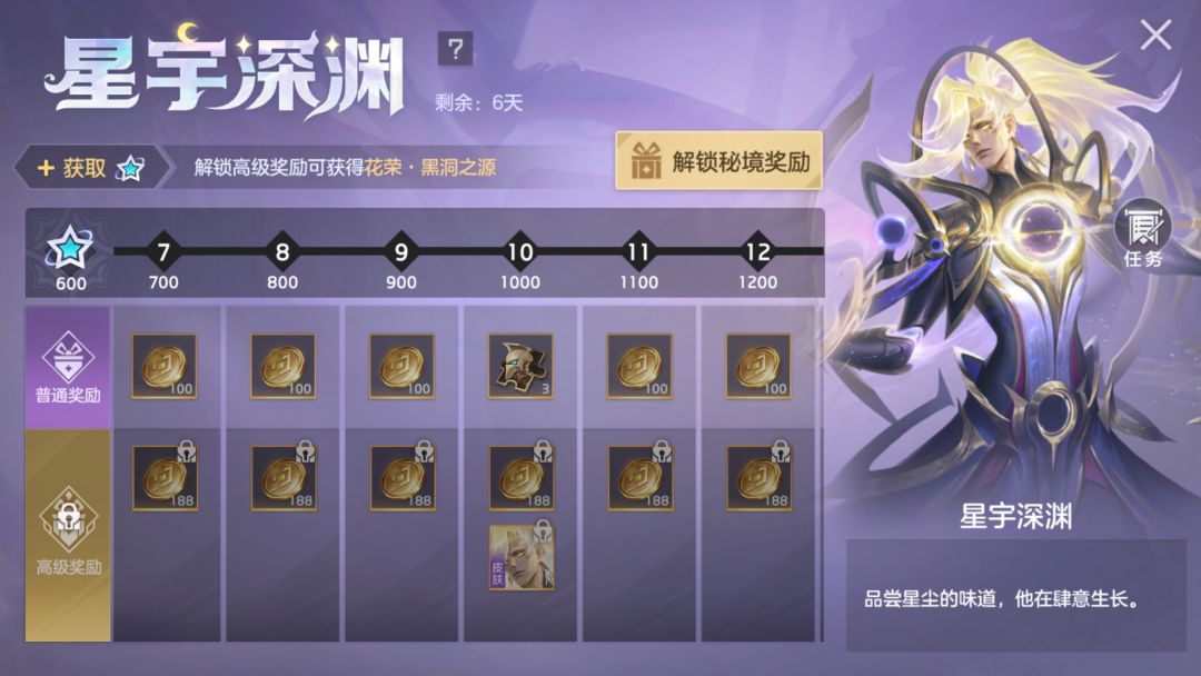 完成任务提升等级免费获得3天满级星盘特权卡、英雄碎片等奖励;付费68元可得新款传说皮肤花荣·黑洞之源、皮肤碎片、花荣好感度礼包;付费128元可额外获得传说皮肤自选箱(内含李文·掣电神龙、墨翟·玄鉴昆仑、花木兰·极速魅影、梅林·神隐千山、荆轲·深海遨游)。