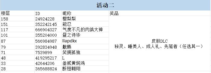 奖品明细:秘灵、睡美人、成人礼、先驱者(任选其一)
