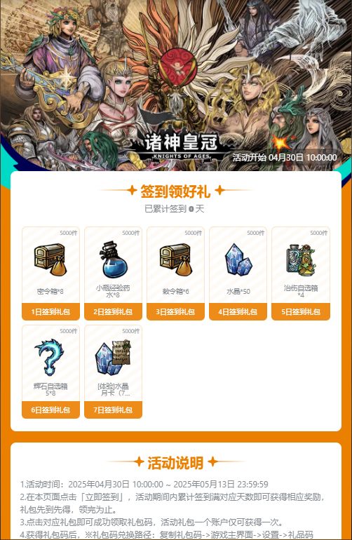 活动开启后,每天进入下方链接点击【立即签到】即可领取一个礼包码,累计签到一定天数后可获得[体验]水晶月卡(7天)~