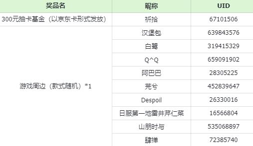 活动结束后,从所有符合要求的居民中,随机抽选1位送出300元抽卡基金(以京东卡形式发放);9位送出游戏周边(款式随机)*1