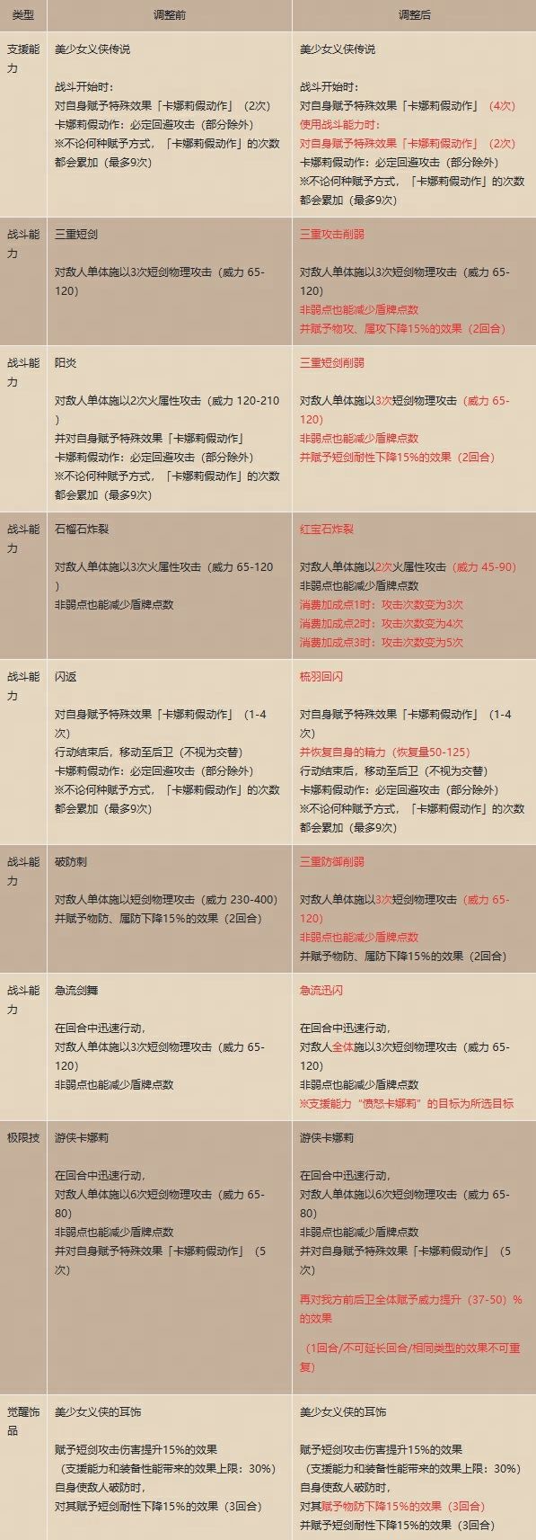 对本期圣炎的引导“卡娜莉”进行了性能调整,详情如下: