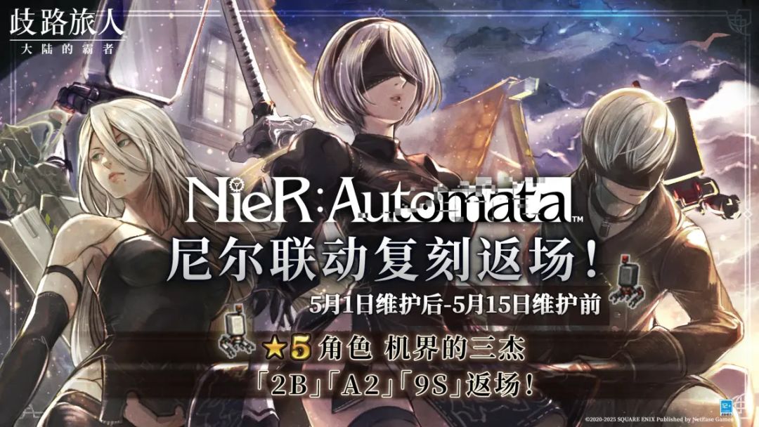 5、尼尔联动回归!限时引导“NieR:Automata联动回归引导-机界的三杰”,5★剑士“2B”、5★游侠“A2”、5★商人“9S”,活动期间每次引导可得“机界的导片(2025/05)”