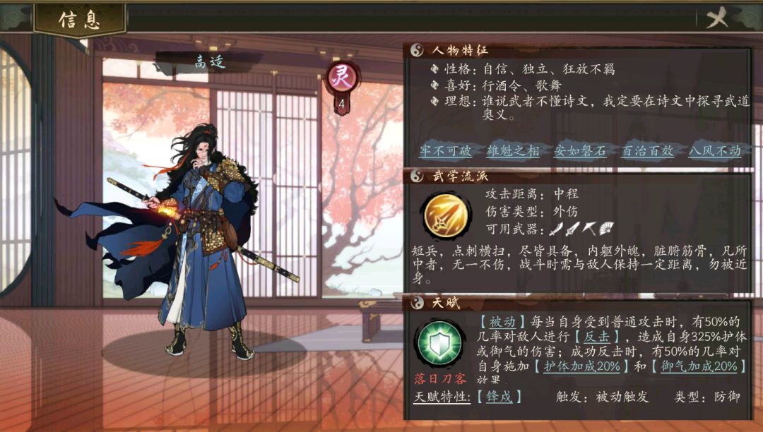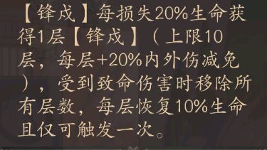 高适的天赋特性为【锋戍】,每损失20%生命获得1层【锋戍】效果(上限10层,每层+20%内外伤减免效果),受到致命伤害时移除所有层数,每层恢复10%生命且仅可触发一次。