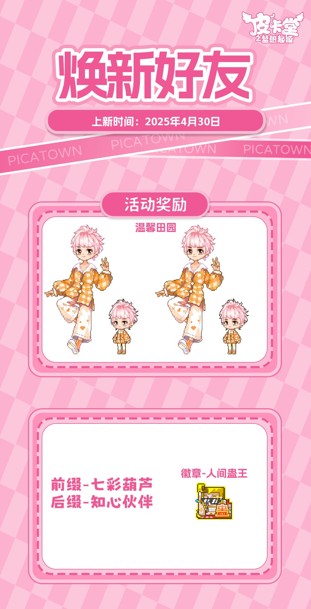 -【焕新好友】皮卡亲集合!是时候展示真正的赛博力量了,邀请小伙伴一起来玩皮卡堂吧!隔壁皮卡亲都凭借焕新好友喜提限定服装了,这河里吗?从现在起,邀请7人解锁「前缀-七彩葫芦」,邀请50人即送「徽章-人间蛊王」,连路过的小镇居民都要对你刮目相看。还在等什么?速速邀人吧!
