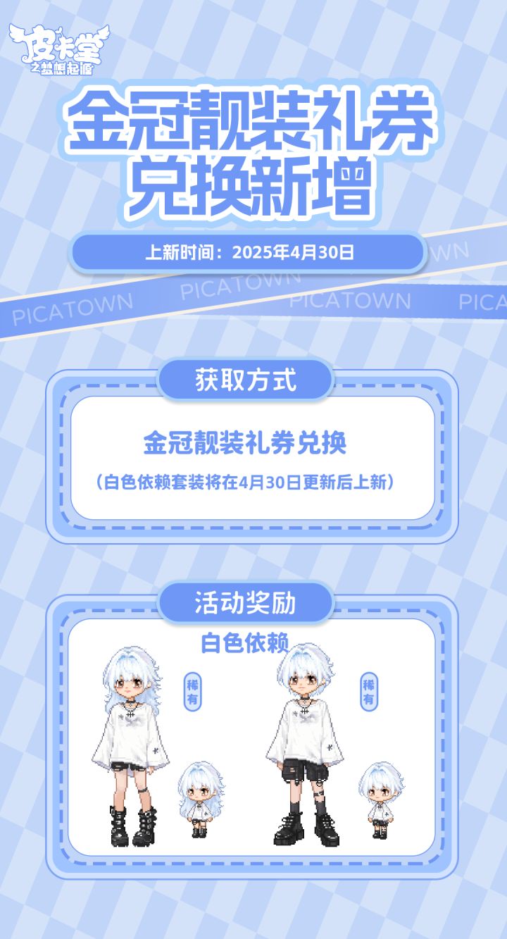 -【金冠兑换】稀有套装「白色依赖」将在4月30日上架金冠商城,购买金冠可获得兑换道具靓装兑换券。