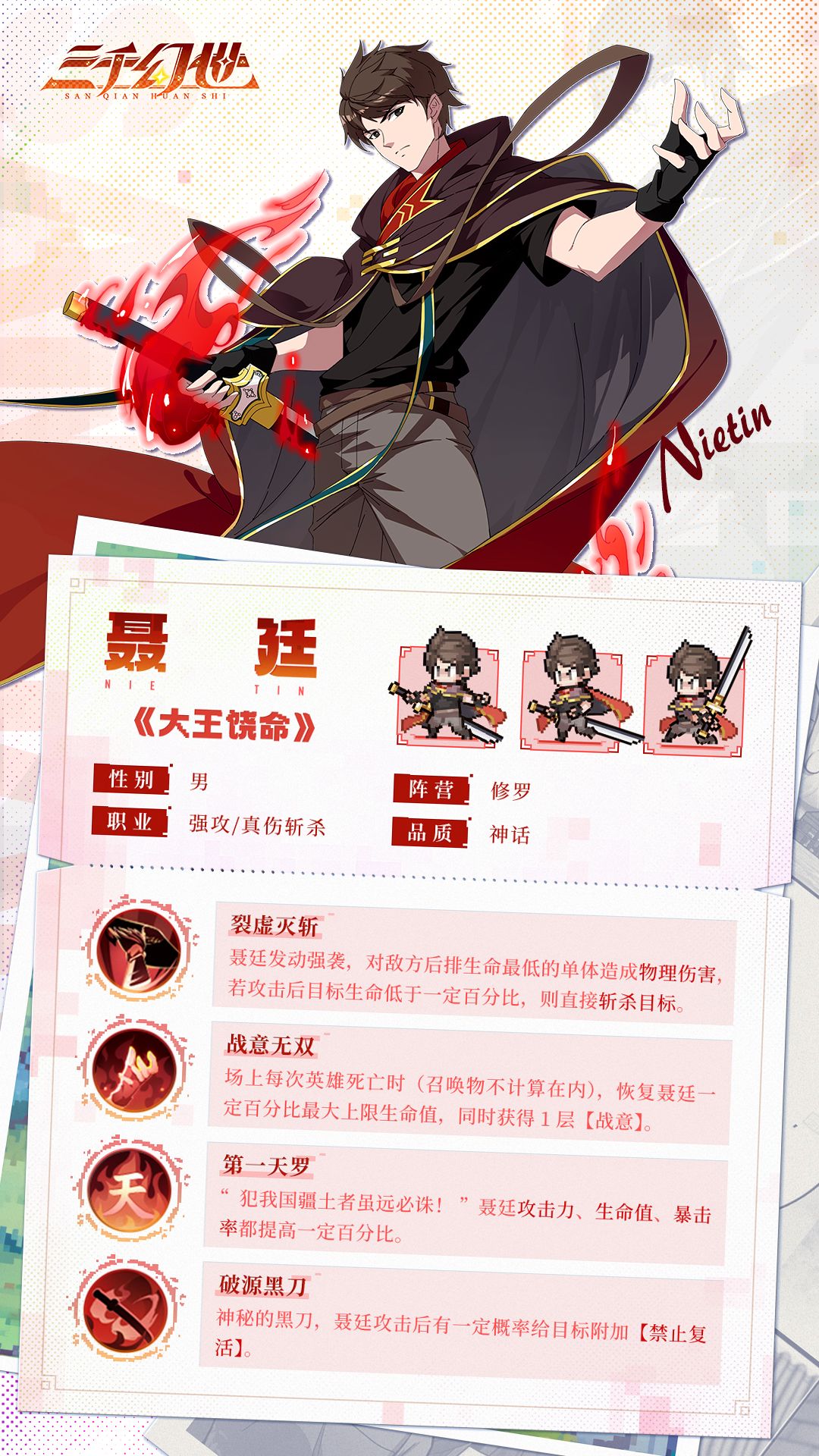 ●技能一:裂虚灭斩聂廷发动强袭,对敌方后排生命最低的单体造成物理伤害,若攻击后目标生命低于一定百分比,则直接斩杀目标