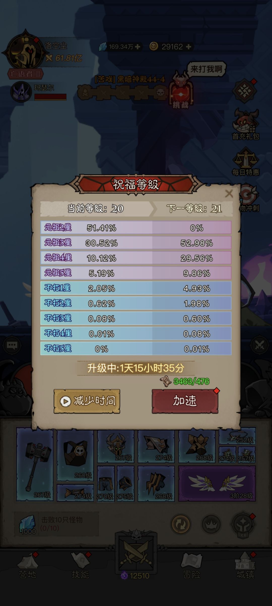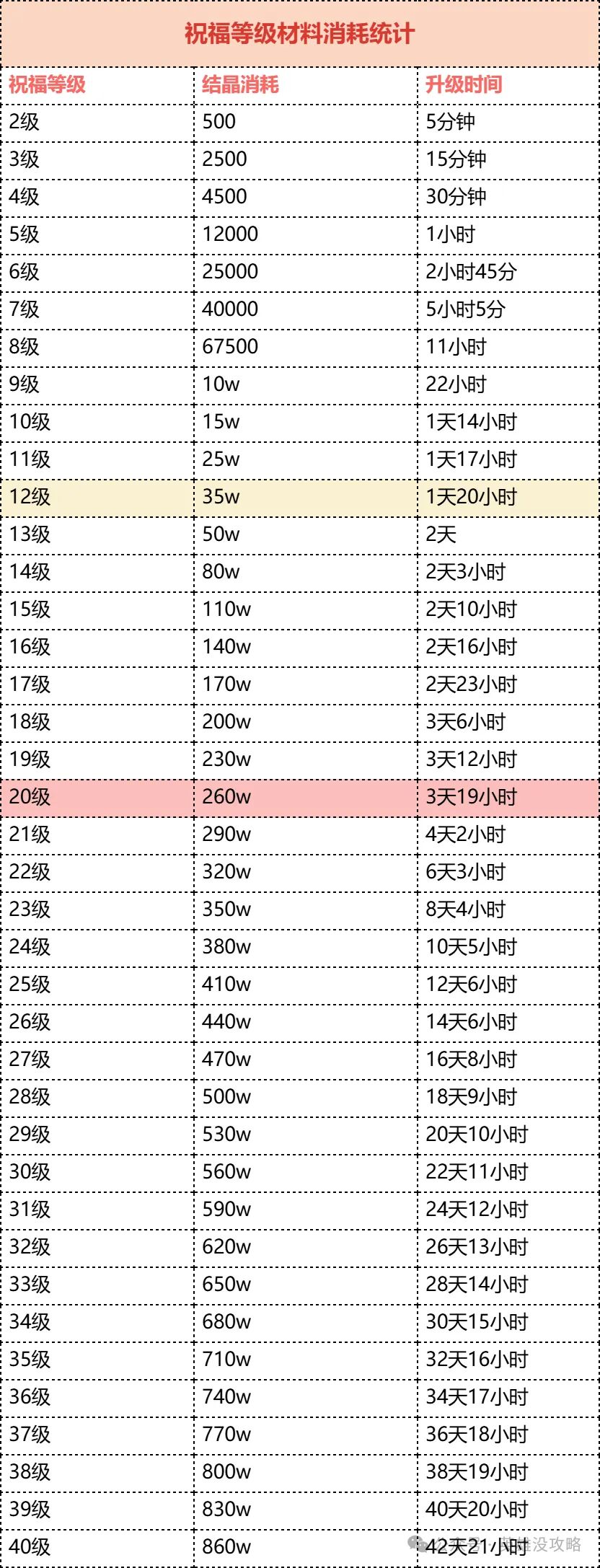 挖矿和祝福等级:新区刚开首推挖5535,也就是主挖加速劵,按照这样挖上午开的区,晚上就能祝福9,在祝福10升11,11升12的时候就可以挖点结晶了,不然容易结晶不够升等级,12以后就该5355主挖结晶,我自己的话现在是手挖,结晶2级我就直接挖了,其他的有4级矿我也挖了,手动实在懒得一直刷了,这张我从微信找的祝福等级所需结晶数可以对照,还有矿的话俩小时会自动刷新,所以有时间的每俩小时上去清一轮
