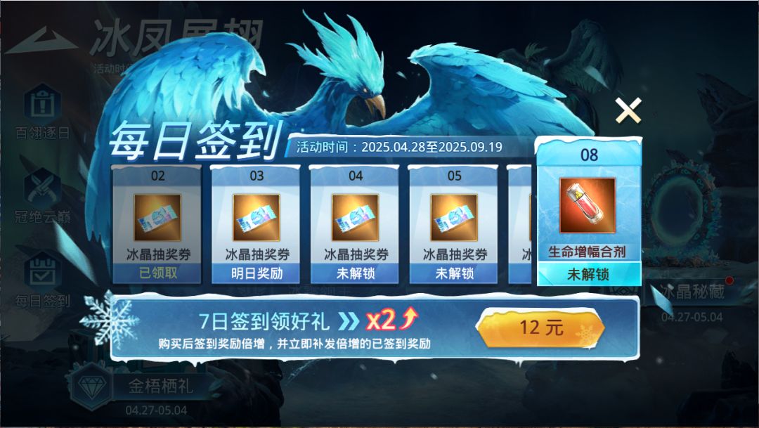 活动期间每日登录可领取当日签到奖励,连续签到第8天额外解锁珍稀终极奖励【生命增幅合剂】。