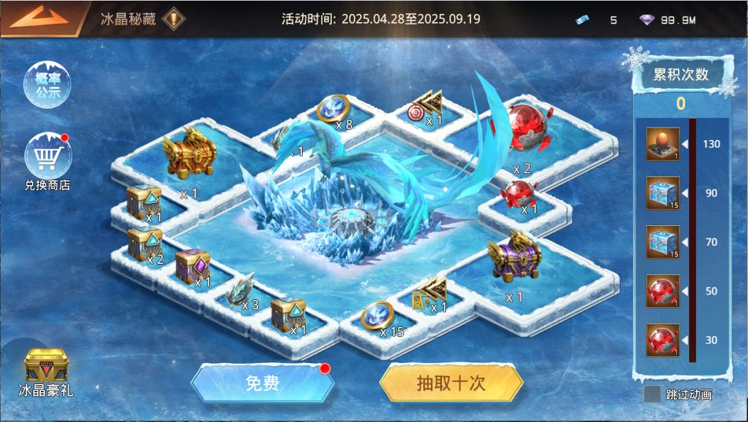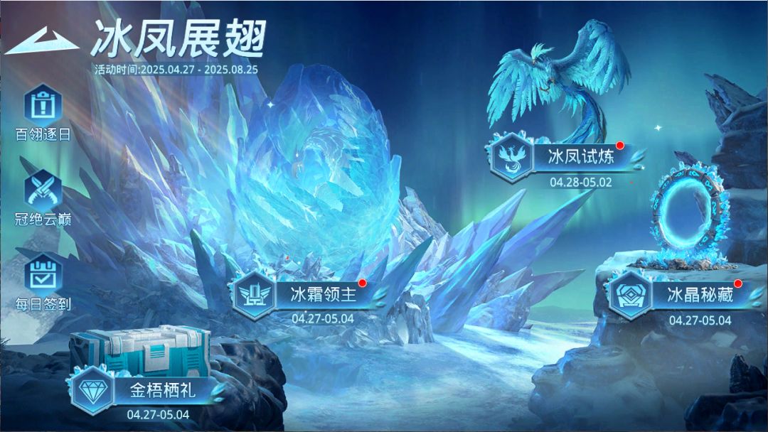 消耗【冰晶抽奖券】可进行抽奖,概率获得珍稀大奖【冰凤展翅基地皮肤】。