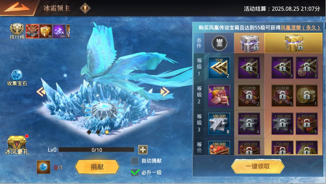 每捐献1个冰晶宝石获得1积分,累计积分可上榜。活动结束后,排行榜名次奖励将通过邮件发放,含【冰凤凰主题基地时装】【高级星石】等。