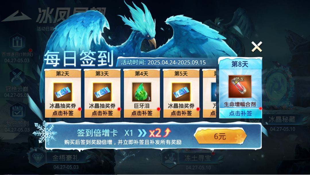 激活【签到倍增卡】可补签,且所有签到奖励翻倍。
