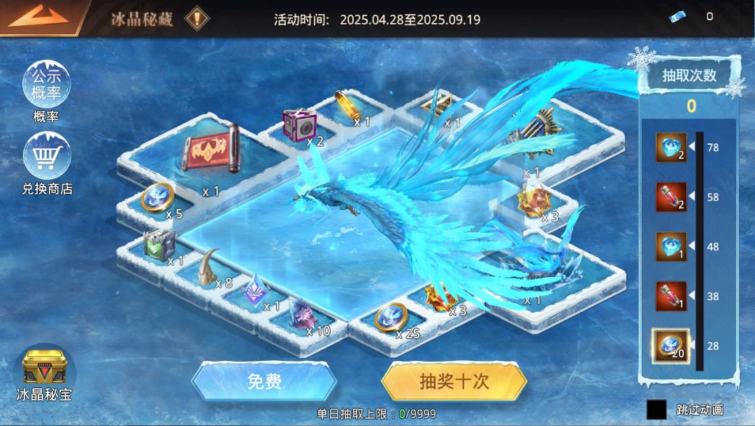 消耗【冰晶抽奖券】可进行抽奖,概率获得珍稀道具奖励。