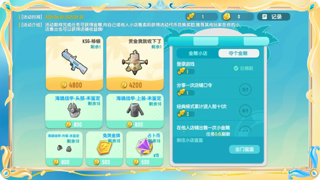 完成任务获取金雕并出售即可获得活动代币,使用活动代币可以兑换全新的枪械皮肤、淘汰郎未鉴定的【海啸战甲】部件以及免哭金牌、占卜币等奖励,与蛋卷一起来看看活动详情吧!