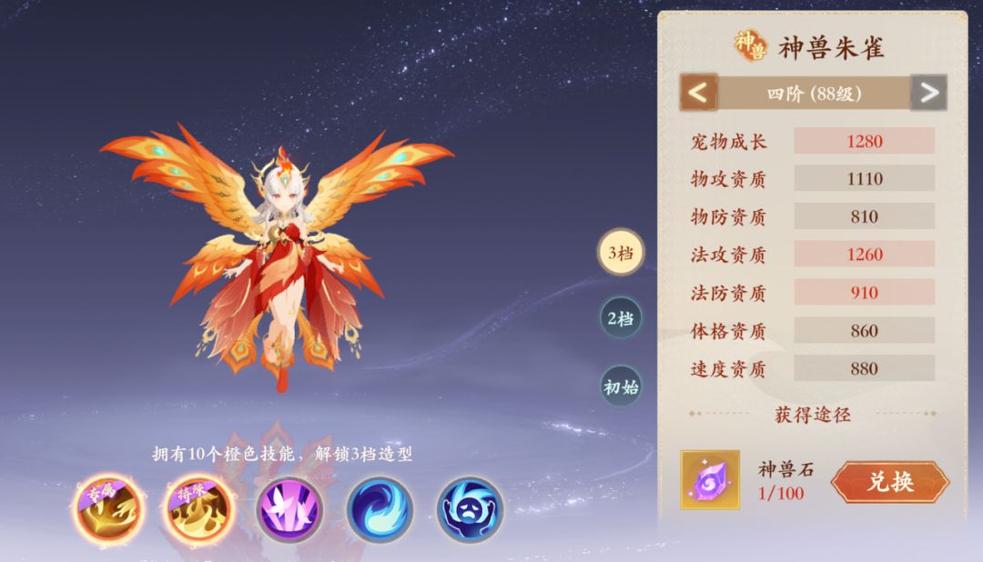 2、朱雀是两段伤害,法爆是必备技能,但是兽灵的法爆不一定是必备的,兽灵搭配最好先升特殊兽灵,然后洗共鸣,看共鸣来取舍裂魂、法爆、锁灵等普通兽灵。