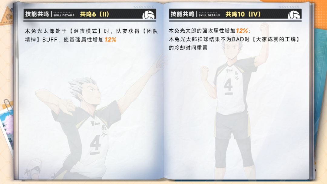 木兔光太郎处于【沮丧模式】时,队友获得【团队精神】BUFF,使基础属性增加12%。