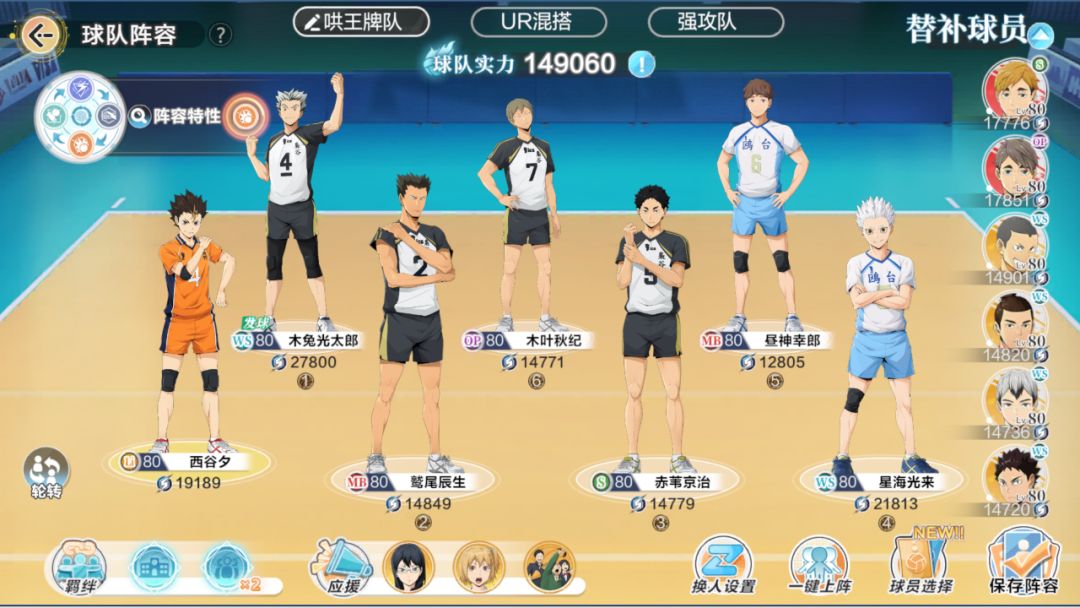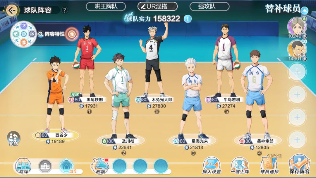 昼神出现后就可以补上场上UR的第六块拼图了,木兔依然是很重要的一环,对全体队友的全属性加成以及快速【士气觉醒】状态都非常重要。自由人很自由,可以任意替换。